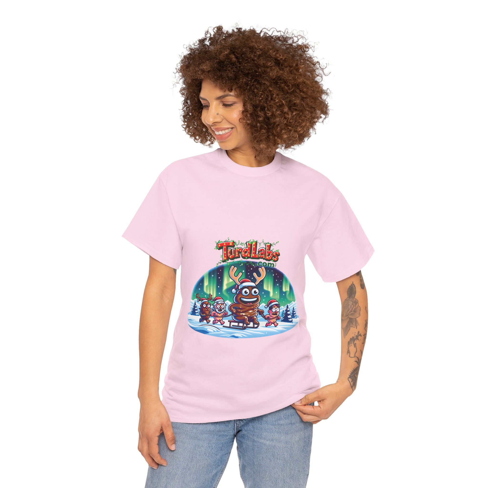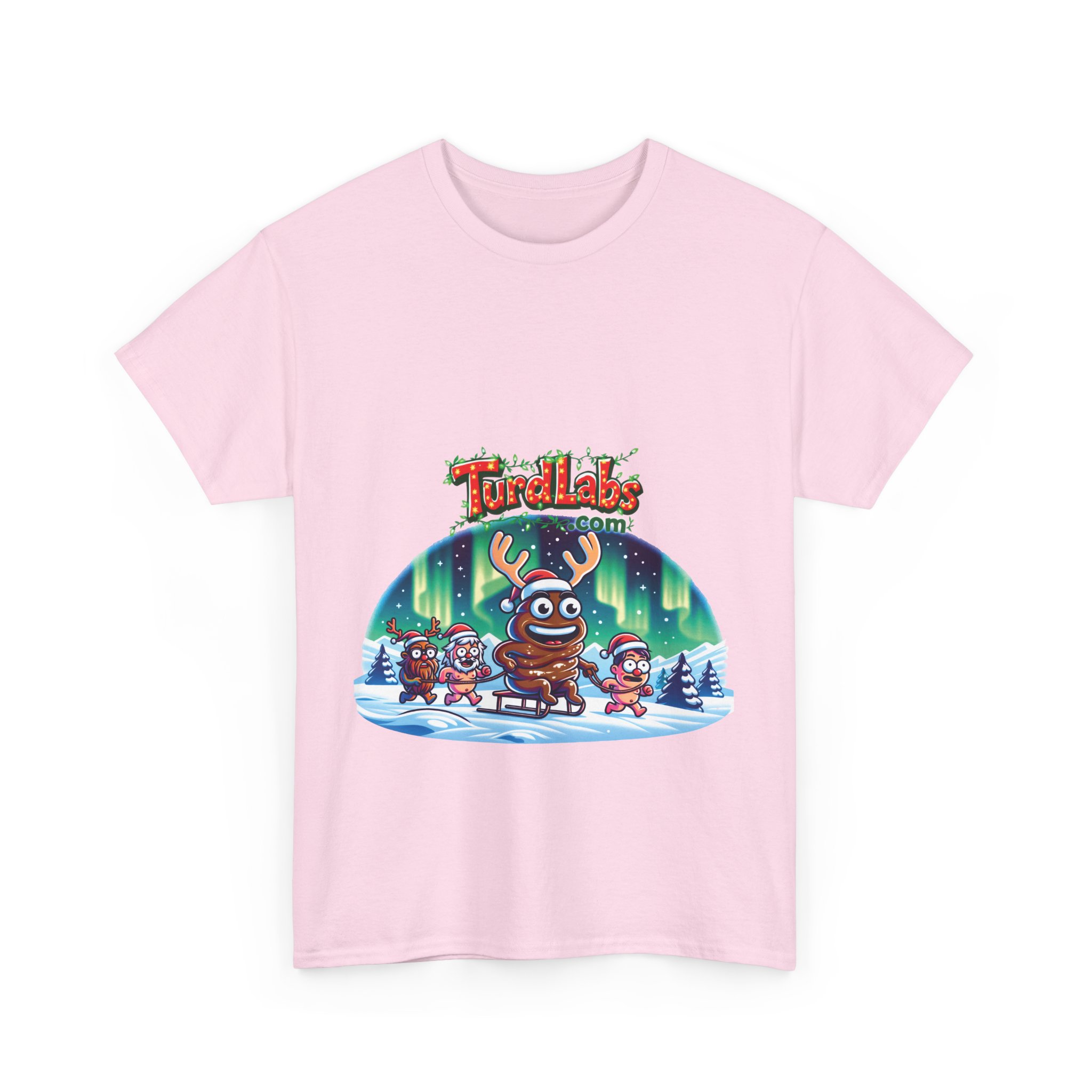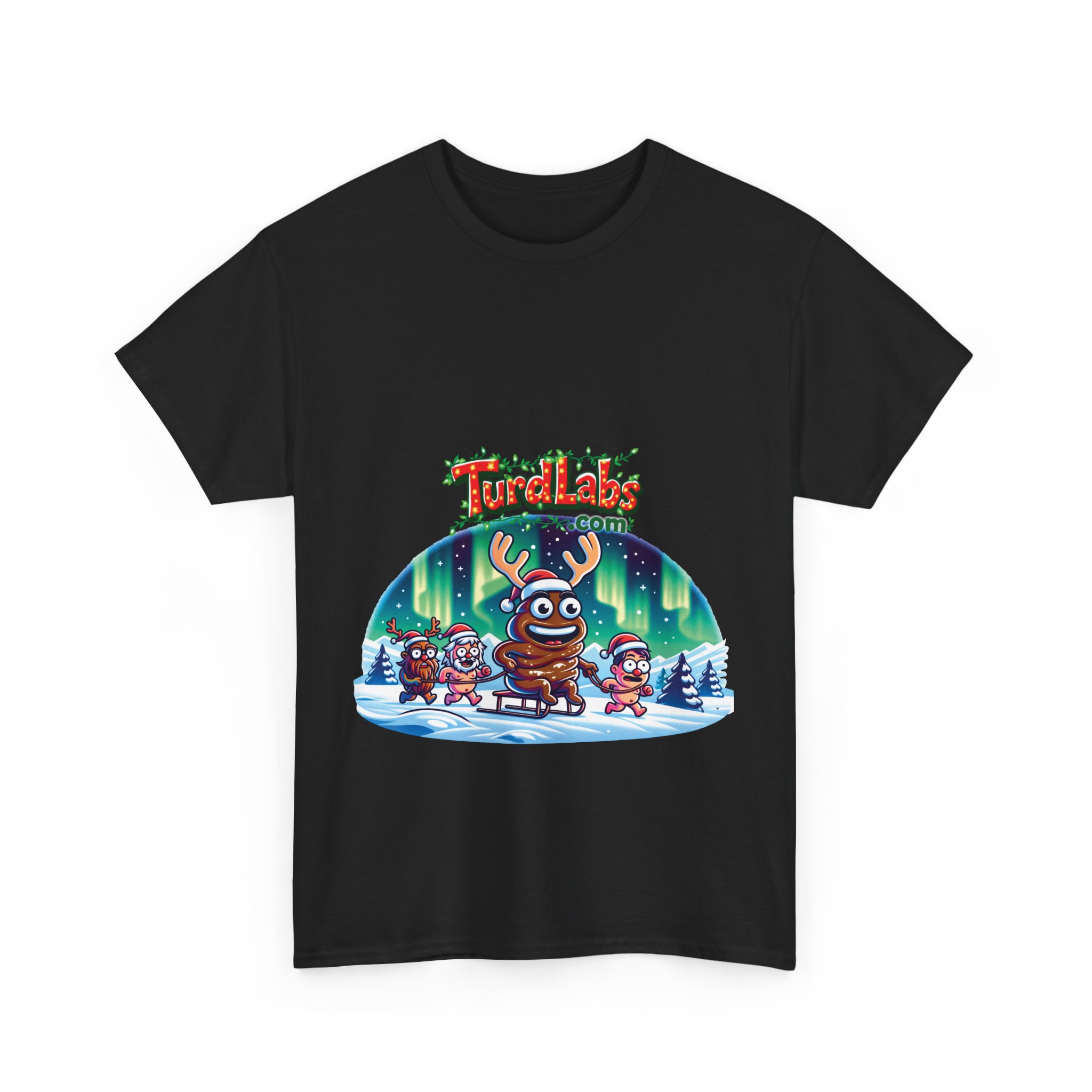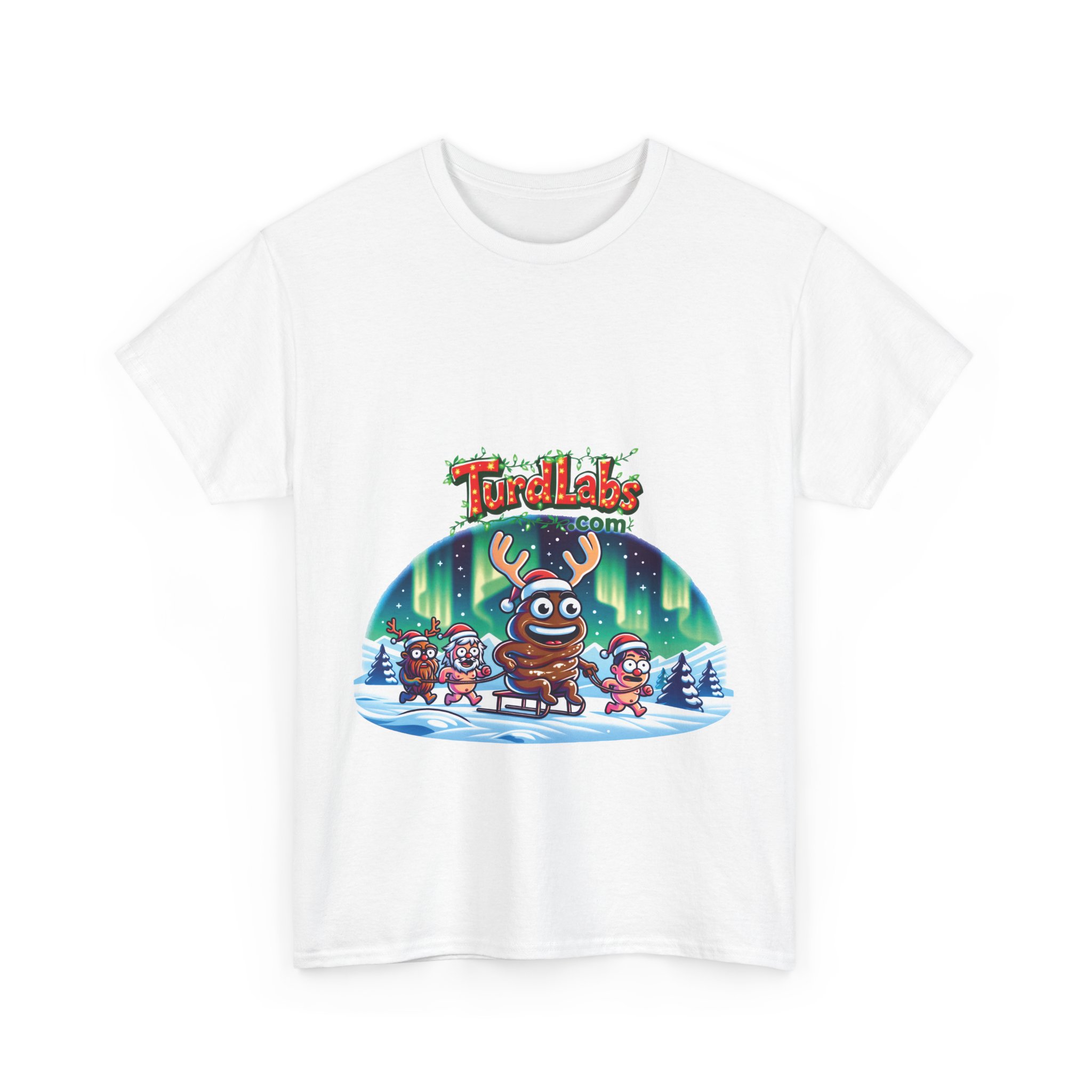 This Christmas, bring the fun and laughter of the holiday season to life with a shirt that tells a story as quirky as it is festive! Picture this: a cheerful turd-turned-reindeer rides on a sled through a snowy wonderland, pulled by a team of Santa hat-wearing companions, while the vibrant Northern Lights shimmer in the sky above. The bold “TurdLabs.com” logo crowns the design, blending absurd humor with festive cheer. This design isn’t just a shirt—it’s a conversation starter. Whether you’re making everyone laugh at the holiday party, standing out in family photos, or looking for that one-of-a-kind gift for the joker in your life, this shirt spreads holiday cheer with a dash of hilarious absurdity.