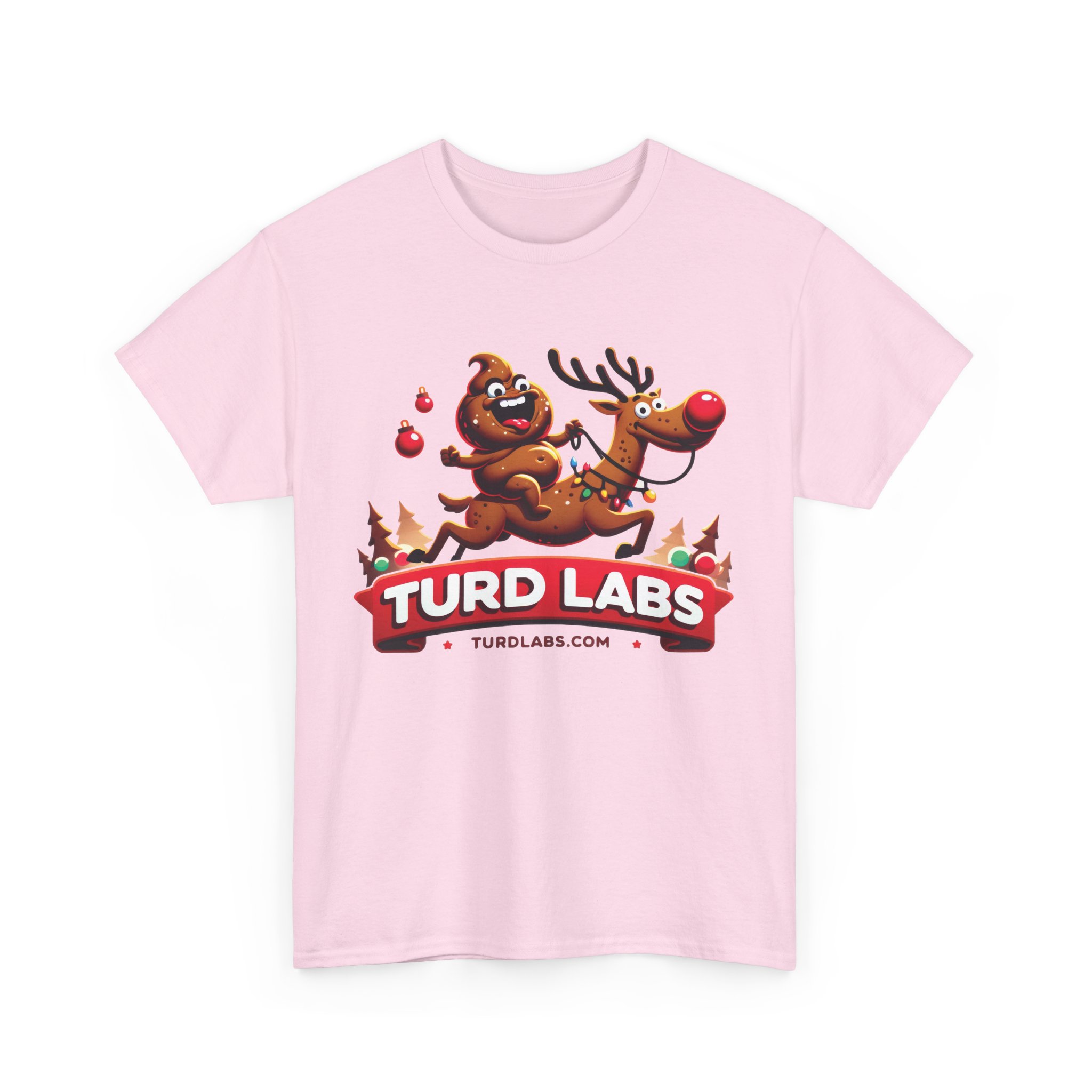 Santa’s sleigh has nothing on this dynamic duo! This hilarious design features a joyful poop character taking the ride of its life on a playful reindeer decked out in festive Christmas lights. With its bright red nose and mischievous grin, the reindeer gallops through a cozy holiday scene of snow-dusted evergreen trees and colorful ornaments. The poop character’s pure excitement and outstretched arms capture the chaotic joy of the season. Topped with a bold red “TURD LABS” banner, this design is perfect for anyone looking to add a fun, cheeky twist to their holiday wardrobe. Whether you’re the life of the Christmas party or giving it as a gift to someone who loves humor, this shirt is guaranteed to spread laughter and holiday cheer.