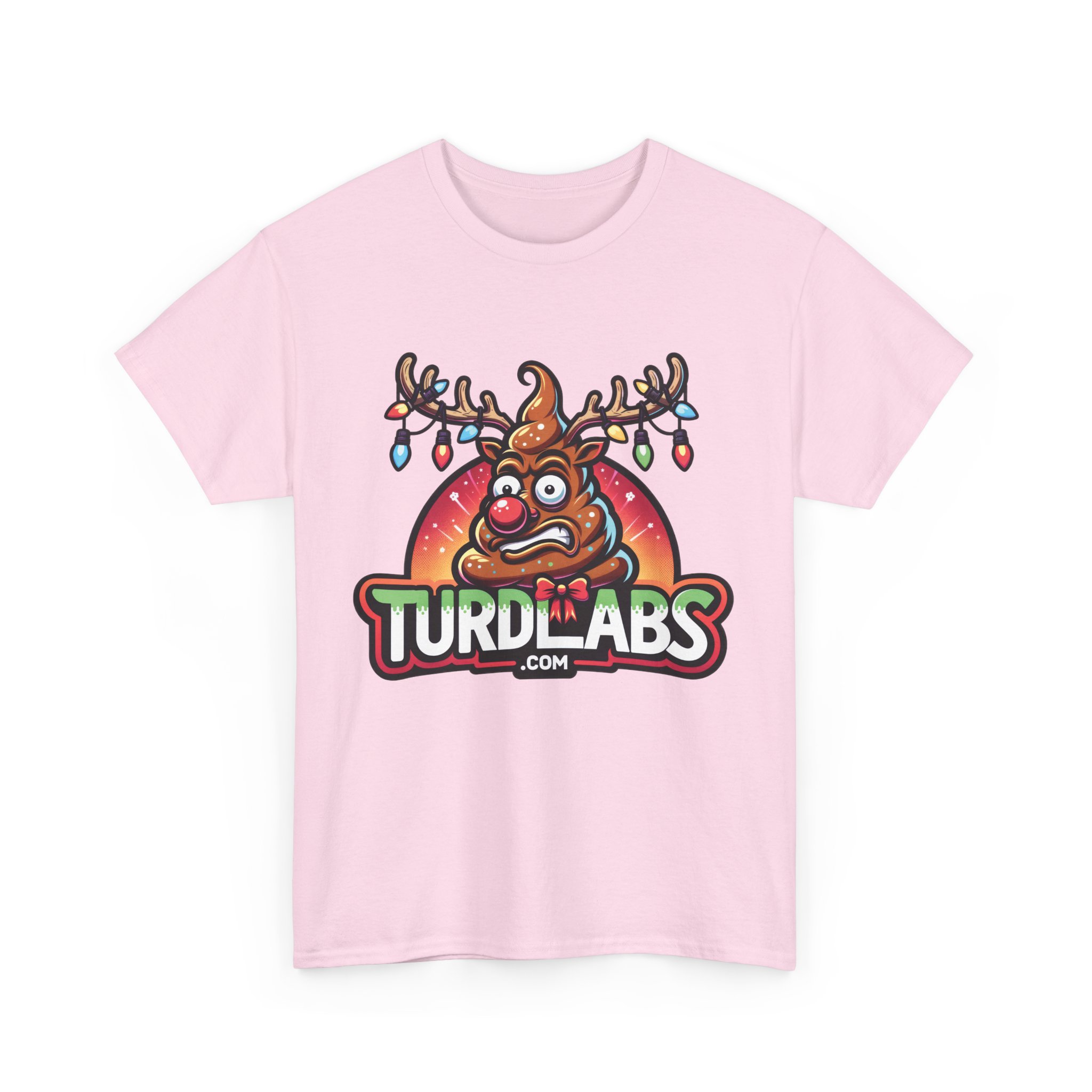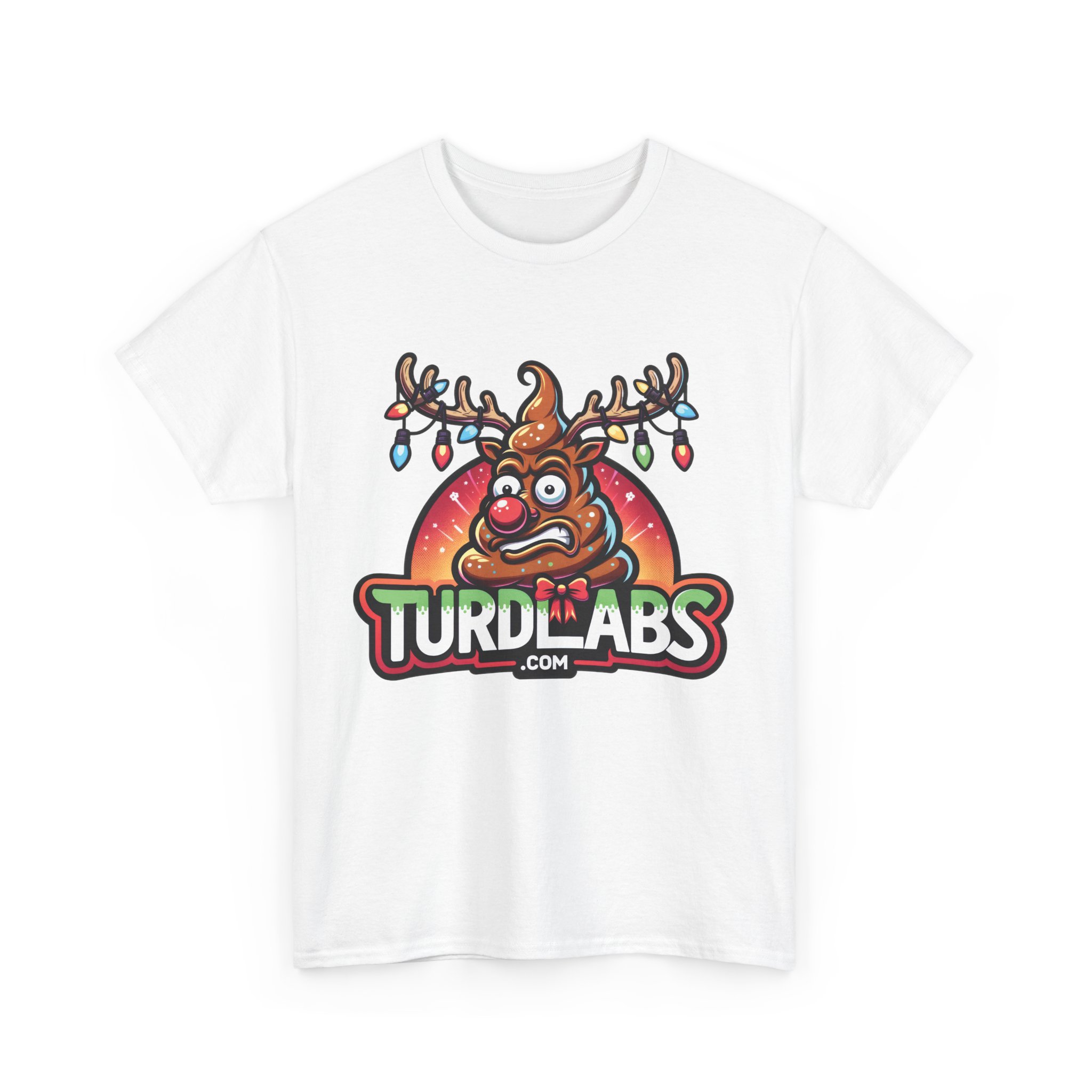 Oh deer, the holidays just got a whole lot funnier! This quirky design features a poop character turned reindeer, complete with tangled antlers adorned with colorful Christmas lights. With a bright red Rudolph nose and a hilariously frazzled expression, this festive figure is ready to bring the laughs to your holiday celebrations. The vibrant backdrop of snowy accents and a bold red-and-orange glow highlights the chaos and cheer of the season. Topped off with a bow tie and the bold “TURDLABS.com” logo, this design captures the humor and spirit of Christmas in a way that’s guaranteed to turn heads. Whether you’re heading to a holiday party or gifting it to someone who loves offbeat humor, this shirt brings festive fun like no other.