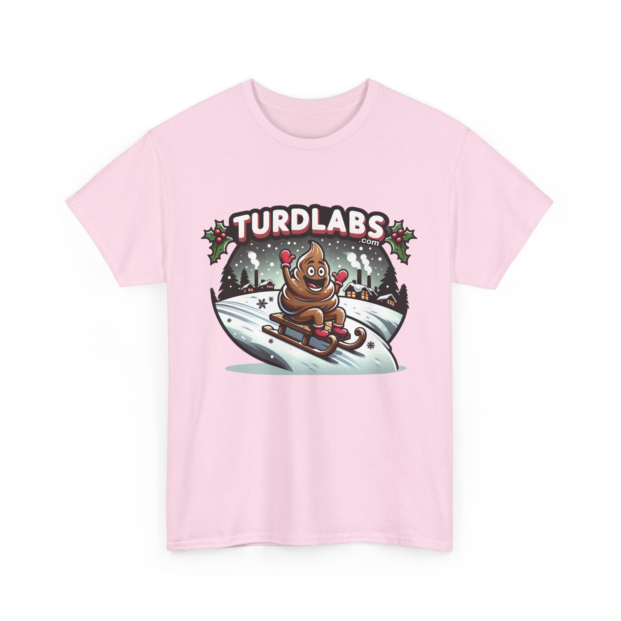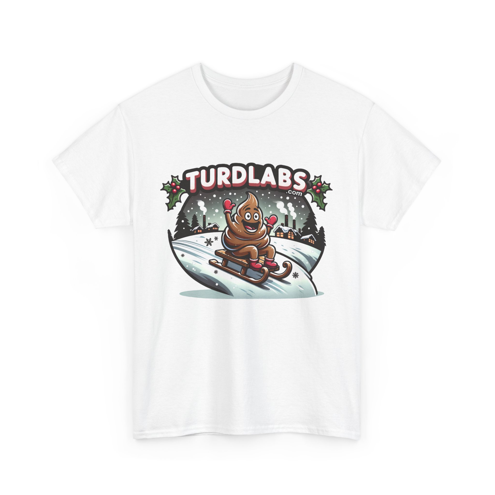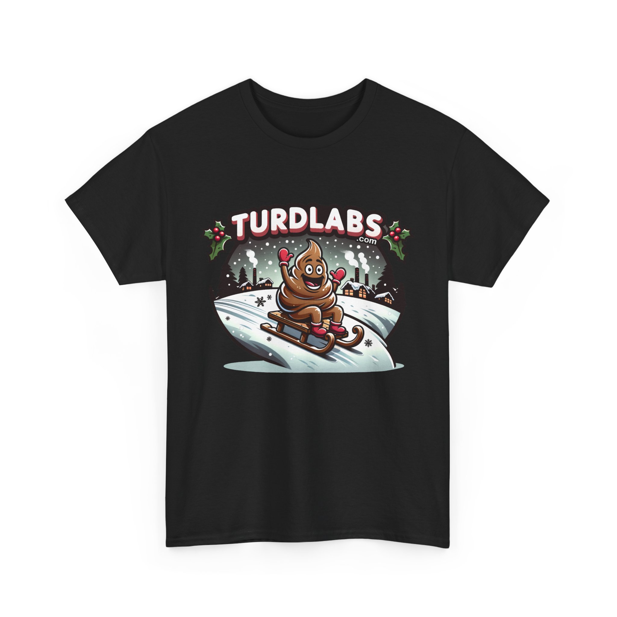 Sled into the holiday season with hilarity and charm! This festive design features a gleeful poop character braving the snowy slopes on a sled, all bundled up with red gloves and boots. The snowflakes fly as the character zooms downhill, surrounded by a cozy winter village complete with glowing windows and chimneys puffing smoke. Framed by festive holly sprigs and topped with the bold “TURDLABS.com” logo, this design captures the whimsy and laughter of winter fun. Whether you’re heading to a holiday party, searching for the perfect gag gift, or just looking to make people laugh, this shirt delivers holiday cheer with a quirky twist.